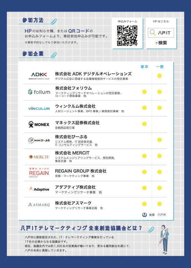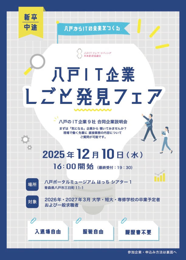 | イベントチラシ | 八戸IT企業 しごと発見フェア チラシ ※チラシ内の「新卒」欄の対象は、2026年3月卒業見込みの方(大学・短大・専門学校)となっております。 |
