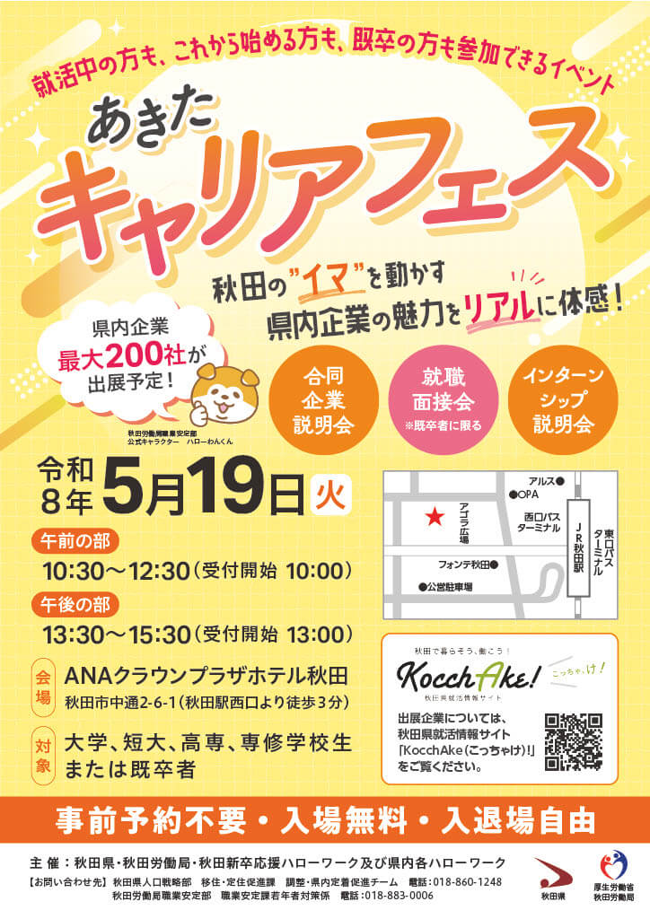 | 詳細 | イベントに関する詳細は「あきたキャリアフェス」HPへ https://kocchake.com/pages/meeting/p33219 |